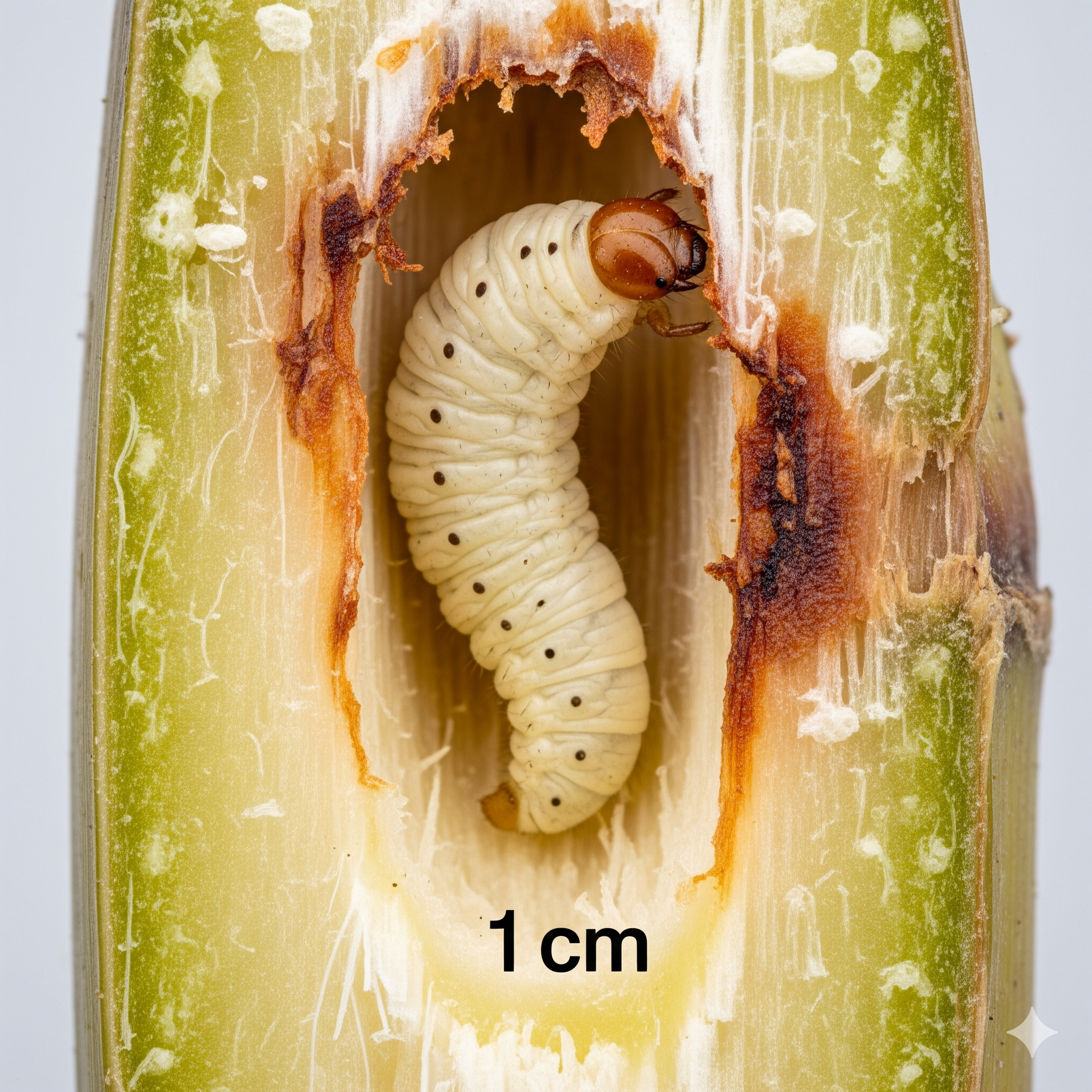• Larvas (lagartas): São a fase mais prejudicial. Após a eclosão, perfuram os colmos da cana, alimentando-se internamente e criando galerias.